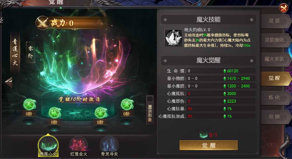 ④.魔火觉醒后获取对应技能效果,每次觉醒提升魔火技能等级和属性